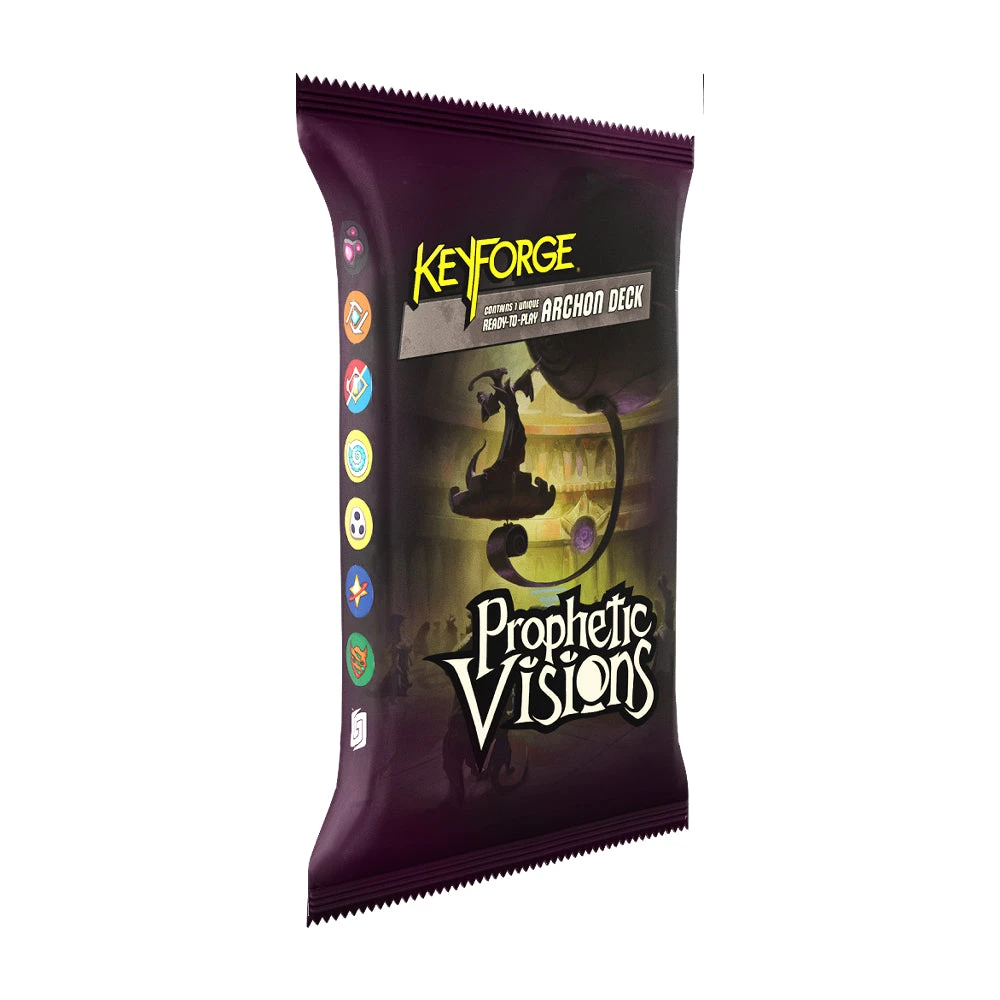 Each KeyForge: Prophetic Visions deck includes several prophecy cards, each with a special trigger condition. During play, other cards with fate effects may be secretly assigned to a prophecy. Once a prophecy’s condition has been fulfilled, the assigned cards are revealed, and all fate effect are resolved.